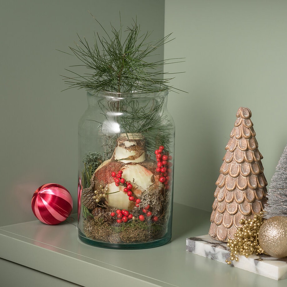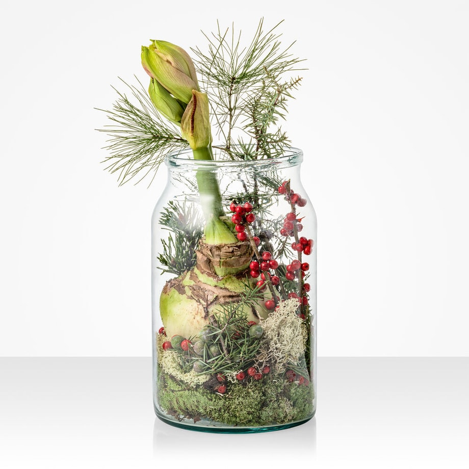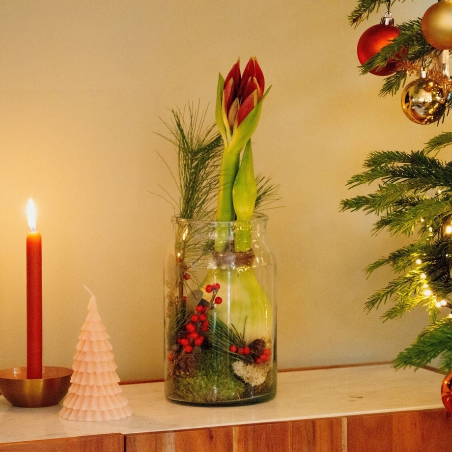 De Amaryllis bol wordt in kerstsfeer opgemaakt in een vaas. De Amaryllisbol wordt omhuld met mooie, houdbare kerst- en groenmaterialen. De bol wordt veelal in de knop geleverd en zal geleidelijk tot bloei komen. Inclusief vaas, de vaas kan variëren.