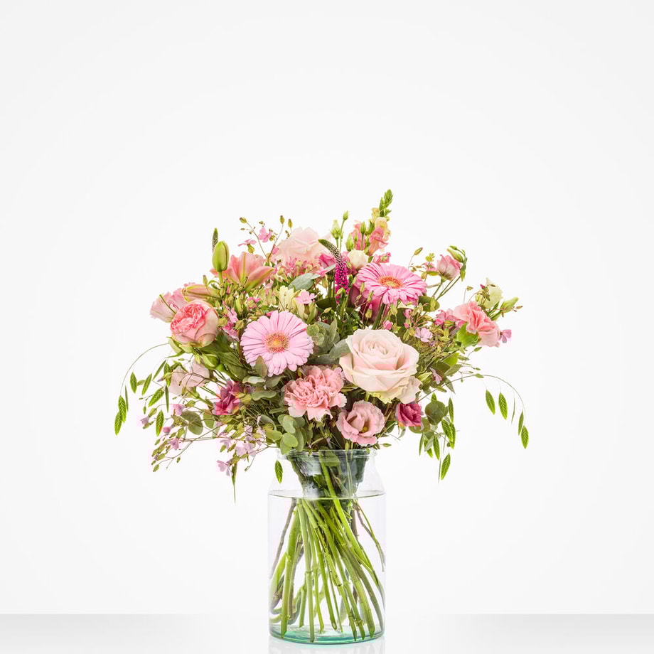 Een waar feestje om te geven én te krijgen. Dit prachtige boeket met roze bloemen om bijvoorbeeld te geven bij de geboorte van een dochter. Laat je verrassen door dit mooie boeket. Het boeket bestaat uit Roos, gerbera, Eustoma. Excl. knuffel en vaas.
