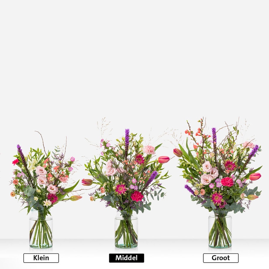 Een fris voorjaarsboeket, passend bij de eerste maand van het nieuwe jaar. In vrolijke en frisse tinten koraal, roze en paars en met typische voorjaarsbloemen zoals de tulp en ranonkel. O.a. samengesteld met Tulp, Ranonkel, Alstroemeria, Chaenomeles. Excl. vaas.