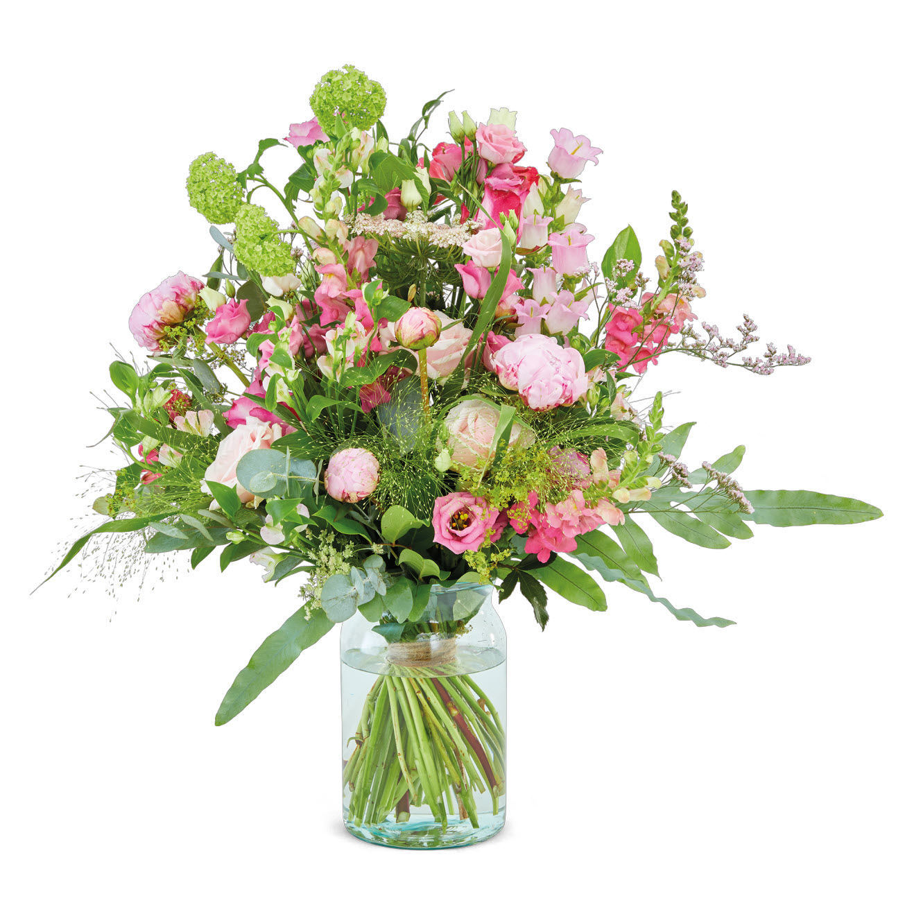 Het boeket Pioenpracht is een luchtig en modern rozekleurig sympothieboeket boeket. Excl. vaas.