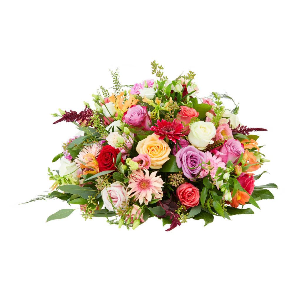Het ronde biedermeier rouwstuk Laatste kus is een prachtig en kleurrijk bloemstuk. Het rouwstuk kenmerkt zich door bijzondere rozen in warme kleuren en roze tinten. Het bloemstuk wordt rond samengesteld. Deze bindwijze staat ook bekend als Biedermeier. Vanaf verschillende kanten zijn de bloemen in het ronde bloemstuk goed te zien.
