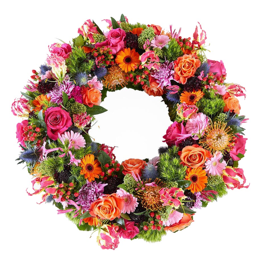 De rouwkrans Oneindige kleuren is warm van kleur en een tikkeltje exotisch of tropisch. Dit rouwstuk is gemaakt van bloemen die in de laatste warme maanden tot de eerste koude dagen veelvuldig voorkomen, zoals bessen, grassen, dahlia’s en mooie hortensia’s.