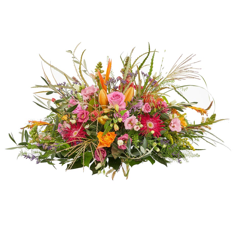 Het ovale rouwstuk Springerige warmte is een modern en kleurrijk bloemstuk. Springerige warmte maakt deel uit van het thema Warm gebaar en kenmerkt zich door de warme kleuren.