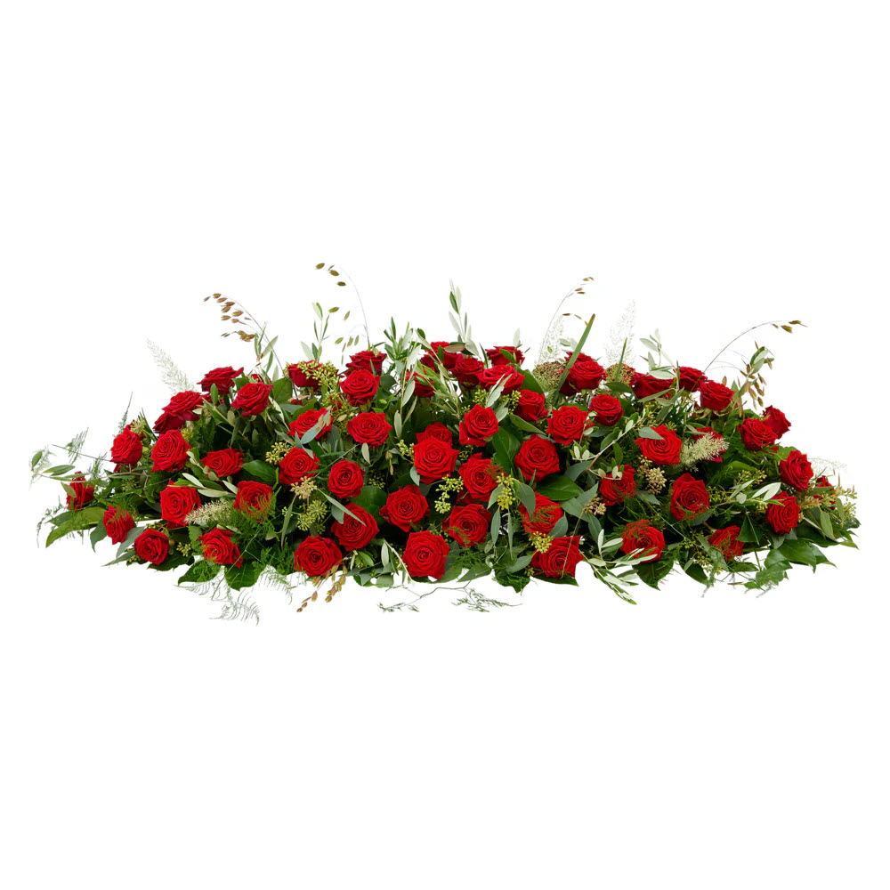 De hele kistbedekking Voor altijd is een tijdloos roodkleurig bloemstuk. De kistbedekking Voor altijd bevat de meest bijzondere rozen in warme tinten. Een rouwstuk kistbedekking betekent dat de volledige kist bedekt wordt door het bloemstuk. Een kistbedekking past goed bij een persoon die hield van bloemen, planten of de natuur. Een prachtig rouwstuk voor een liefdevol afscheid.