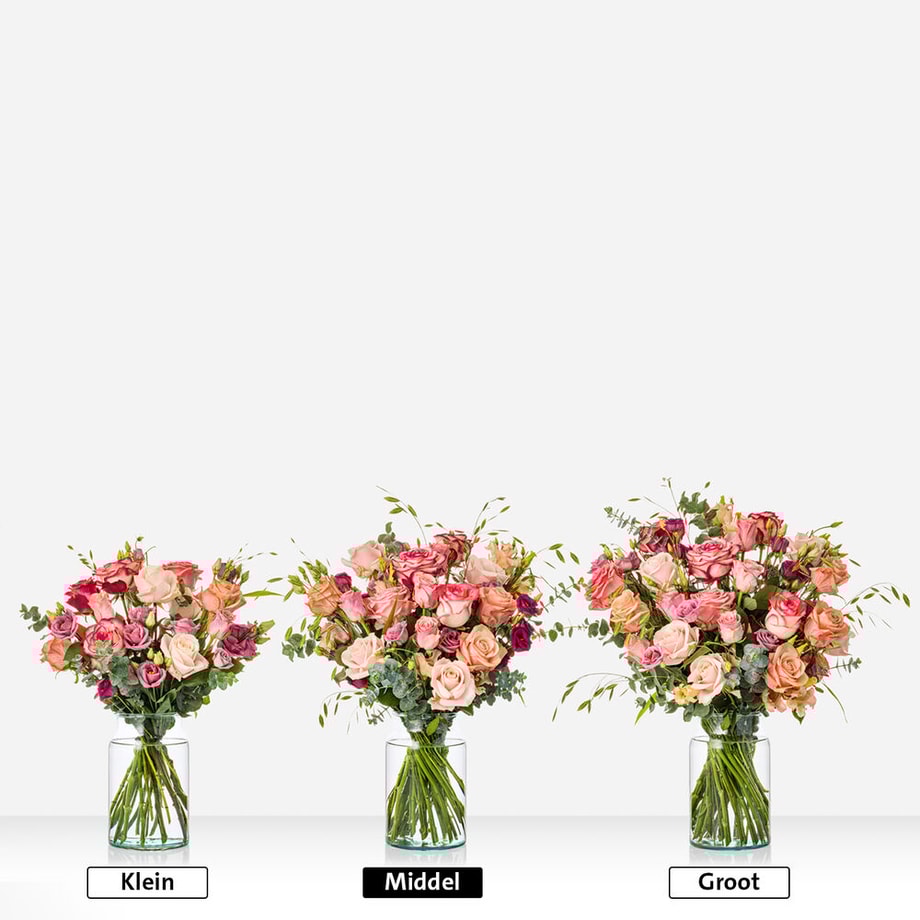 Verras met dit prachtige boeket gevuld met de mooiste roze rozen die symbool staan voor geluk en waardering. De verschillende tinten rozen geven dit boeket een romantische en elegante uitstraling. Excl. vaas.