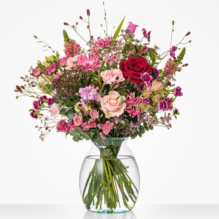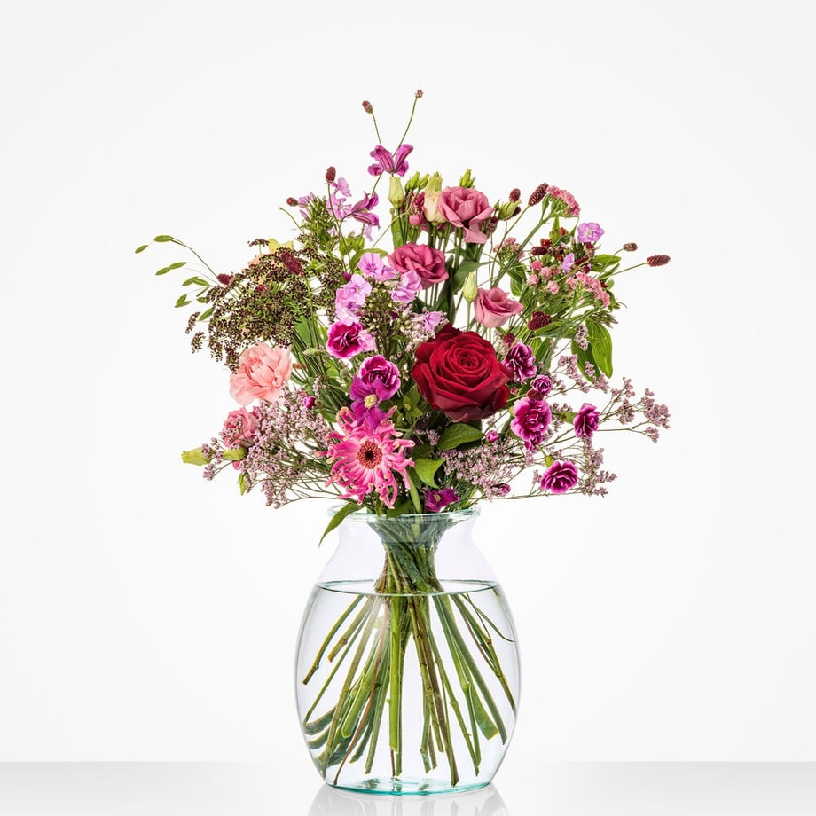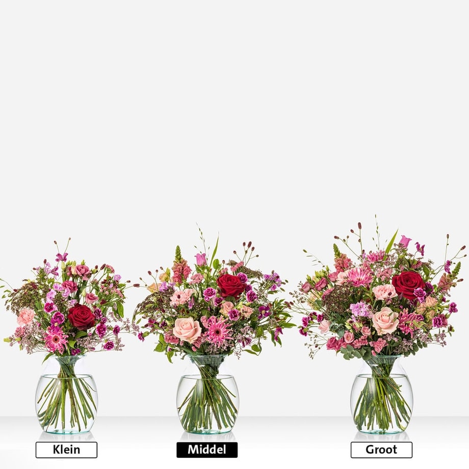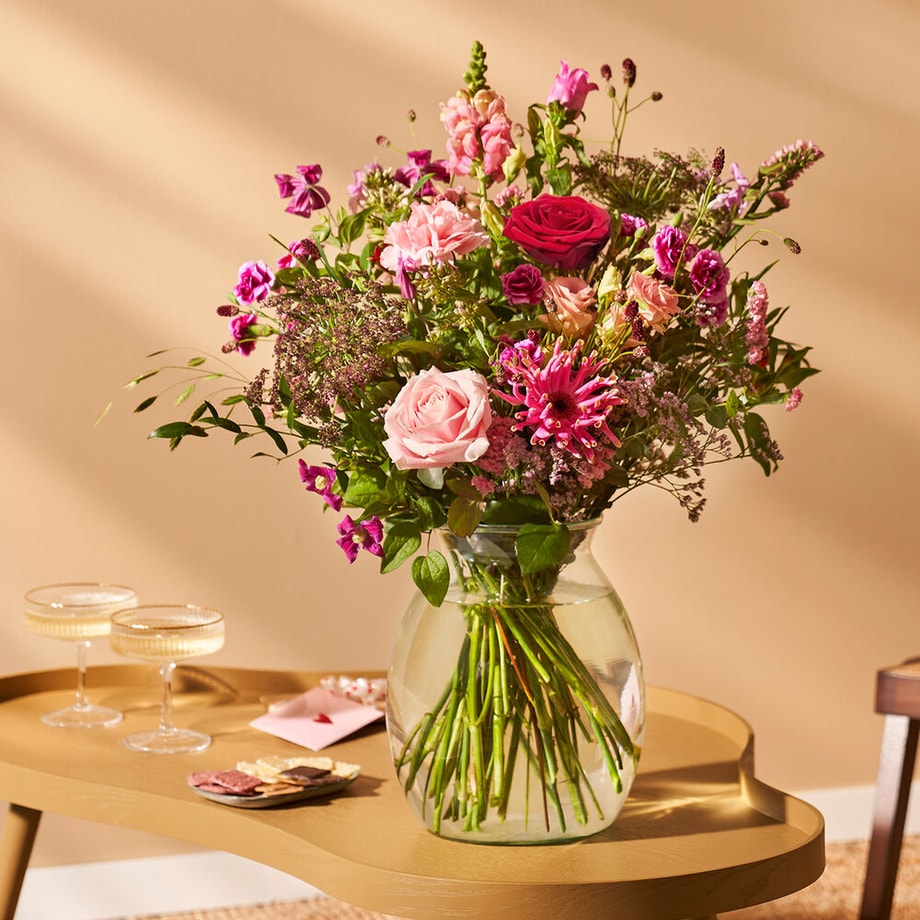 Breng liefde tot bloei op Valentijnsdag met dit ultieme Valentijnsboeket. Met liefde, aandacht en de mooiste bloemen van het seizoen samengesteld door de lokale vakbloemist. Dit Valentijnsboeket bevat prachtige bloemen in diverse roze en paarstinten. Het boeket bestaat o.a. uit Roos, Anjer, Gerbera. Excl. vaas